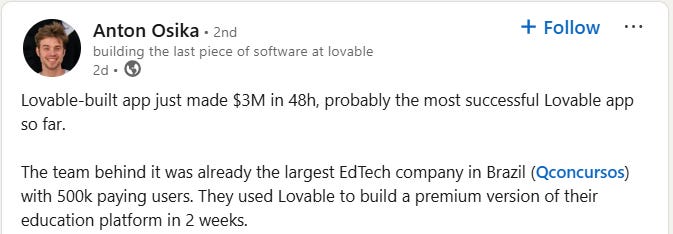 • Brazilian edtech leader Qconcursos built an upgraded educational platform using Lovable, launched by just two developers in one month, supporting 500,000 users;