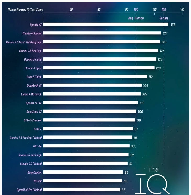 • OpenAI's o3 model achieved the highest cognitive score in Voronoi's AI benchmark test, scoring 135 on Norway’s Mensa IQ test, surpassing the human average of 90–110;