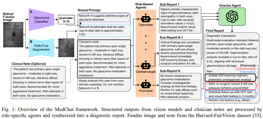 • Researchers have developed MedChat, a multi-agent framework integrating specialized vision models with role-specific LLMs to improve multimodal diagnostic reliability and reporting for glaucoma detection;