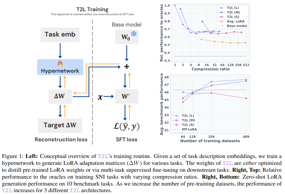 • T2L exhibits strong performance by reconstructing task-specific LoRA adapters, compressing multiple LoRAs, and zero-shot generalizing to unseen tasks, showcasing a step toward efficient model specialization;