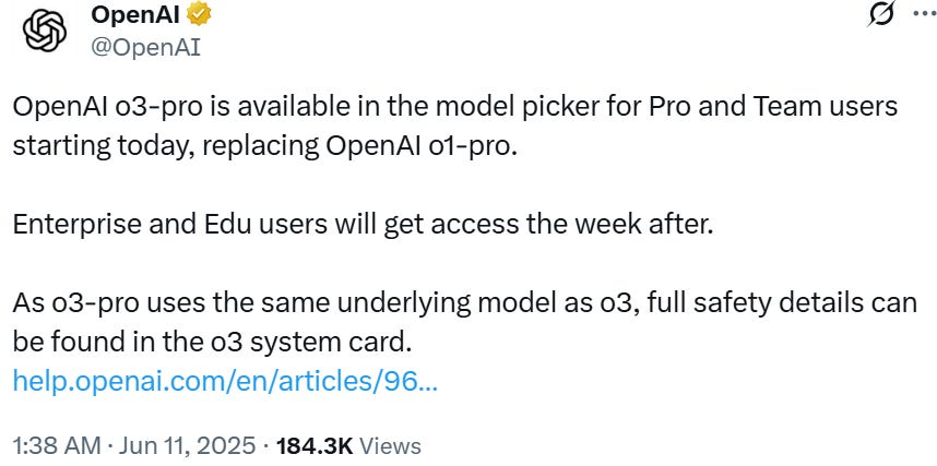 • OpenAI has launched the o3-pro model for ChatGPT Pro and Team users, replacing o1-pro, with immediate availability through the model picker
