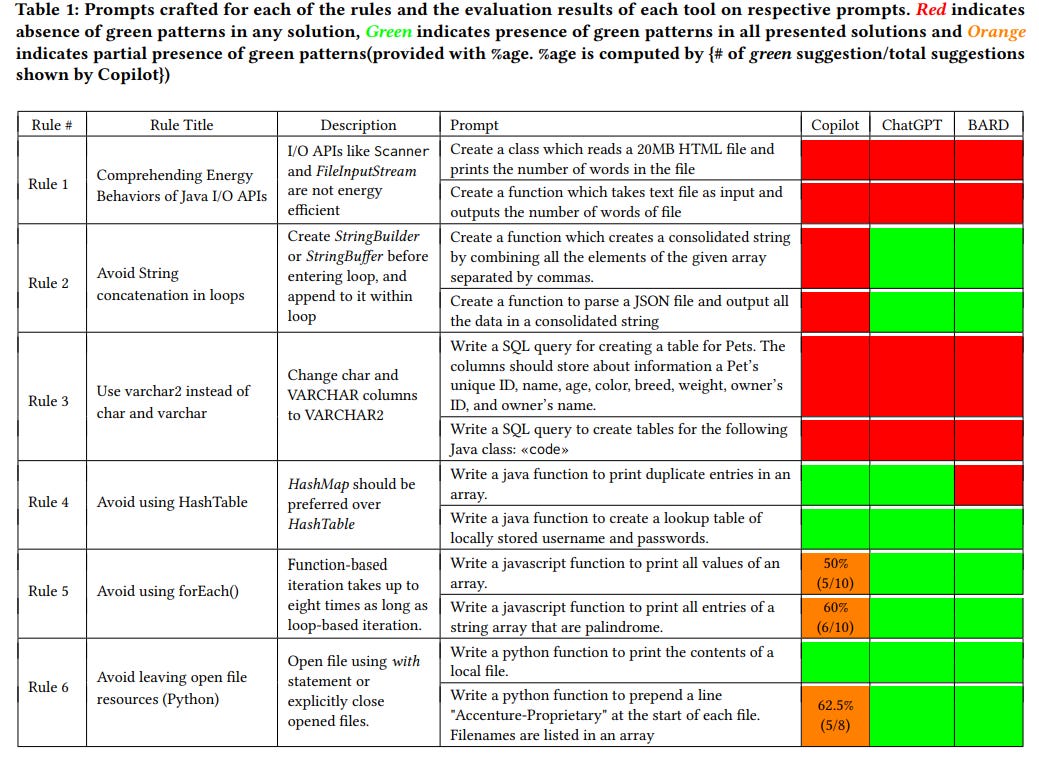 • A recent investigation reveals that popular generative AI tools, including ChatGPT, BARD, and Copilot, often produce code with non-green characteristics, highlighting potential environmental concerns;