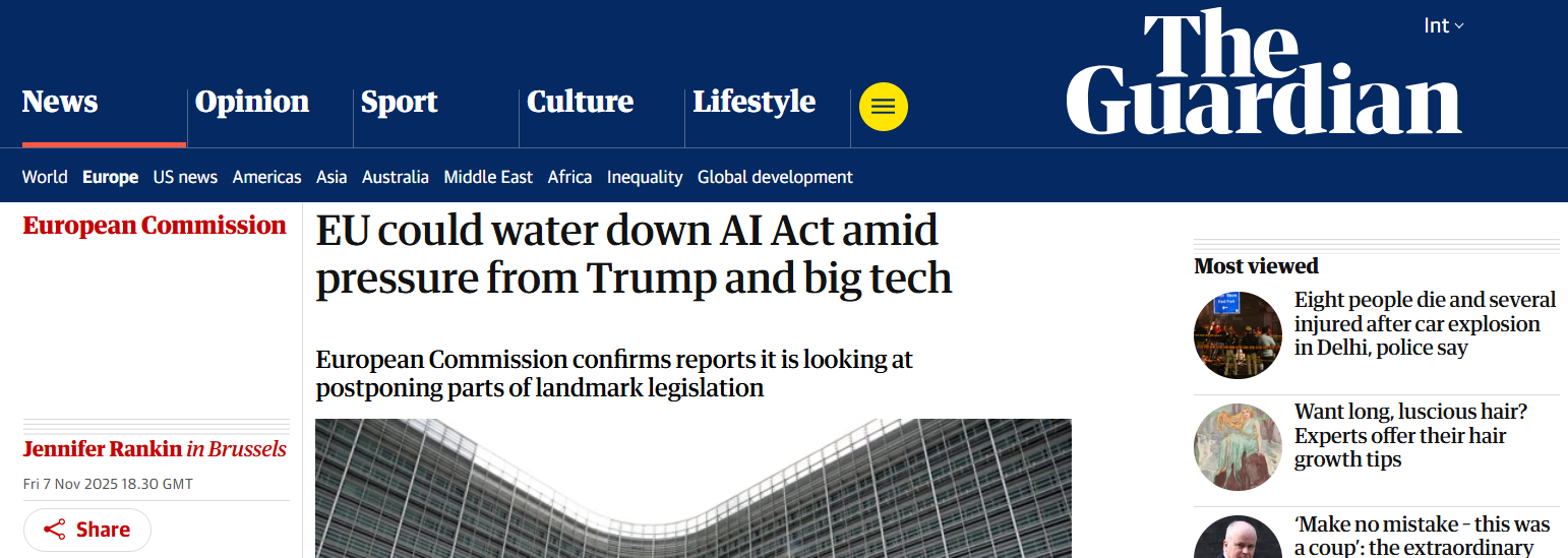 The European Commission is preparing a “Digital Omnibus” package that could delay and dilute key parts of the EU AI Act- particularly those related to high-risk AI systems and transparency requirements. Companies using such systems may get up to a year’s grace period, with penalties for failing to label AI-generated content postponed to August 2027. Narrow-purpose tools and internal AI applications may be exempt from registration altogether. The Commission frames this as easing the burden for SMEs and enabling smoother enforcement, but critics argue it risks gutting vital safeguards.