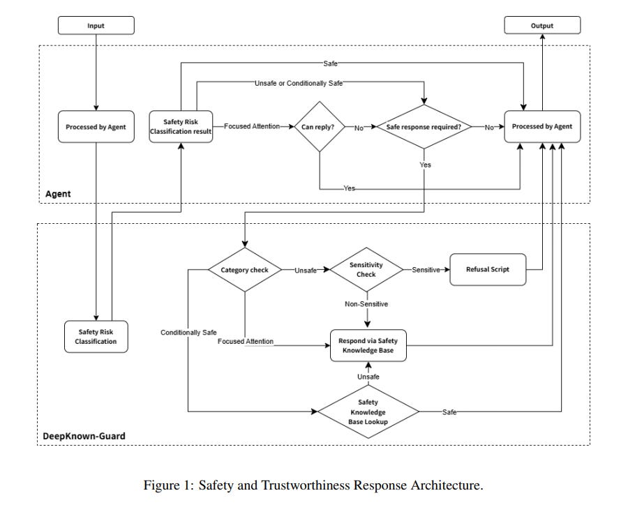 Beijing Caizhi Tech has developed DeepKnown-Guard, a proprietary safety response framework aimed at addressing security challenges associated with Large Language Models (LLMs). The framework enhances input and output safety through a sophisticated classification model and Retrieval-Augmented Generation (RAG), achieving a 99.3% risk recall rate and ensuring that outputs are grounded in real-time, reliable data. Unlike other binary risk approaches, DeepKnown-Guard uses a four-tier taxonomy to identify nuanced risks, demonstrating superior performance on both public safety benchmarks and high-risk test scenarios, thus offering a robust solution for deploying high-trust LLM applications in sensitive domains.