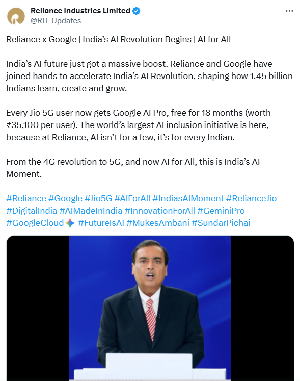 Reliance Jio Expands Free Google AI Offer to All 5G Users in India