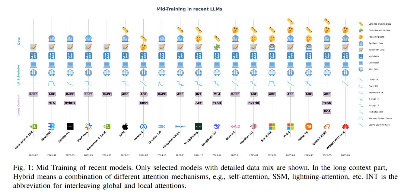 The Journal of LaTeX Class Files recently published a survey on the emerging “mid-training” phase in large language model (LLM) development, which serves as an intermediary step between general pre-training and task-specific fine-tuning. This stage involves a series of annealing-style phases that refine data quality, optimize learning rates, and extend context lengths, thus enhancing the models’ convergence stability and capability. The survey highlights that mid-training helps mitigate diminishing returns from noisy data and improves generalization and abstraction through perspectives like gradient noise scale, the information bottleneck, and curriculum learning. Despite its growing importance in state-of-the-art systems, this survey marks the first comprehensive review of mid-training as a coherent paradigm, providing a framework for structured comparisons across models and identifying challenges for future research.