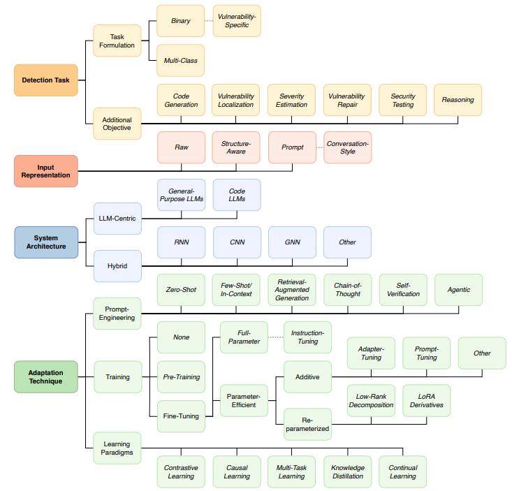 • Analysis of 227 studies categorizes them by task formulation, system architecture, and dataset characteristics, providing a structured overview of current software vulnerability detection approaches.