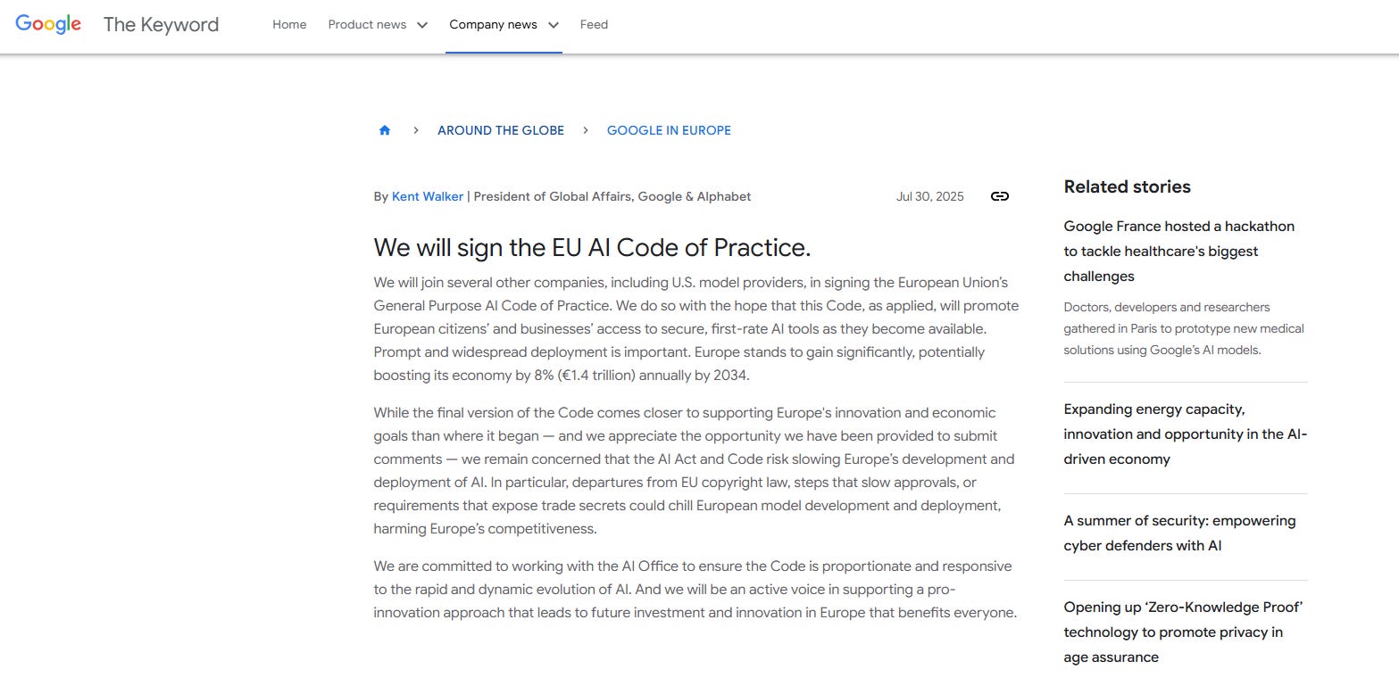 Google Agrees to Sign EU AI Code of Practice Amid Industry Divisions