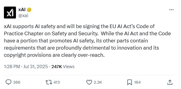 xAI to Sign EU AI Code’s Safety Chapter, Citing Innovation Concerns