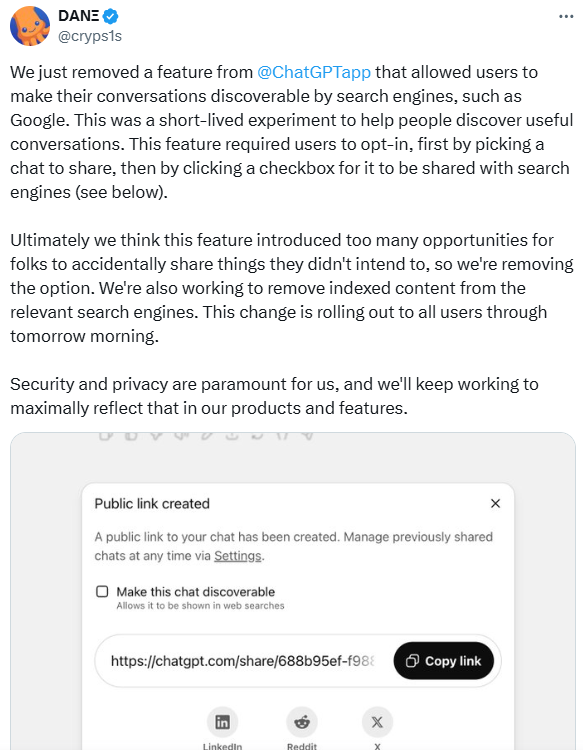 - OpenAI removed a ChatGPT feature allowing public conversations to be indexed by search engines, citing concerns over unintended information sharing