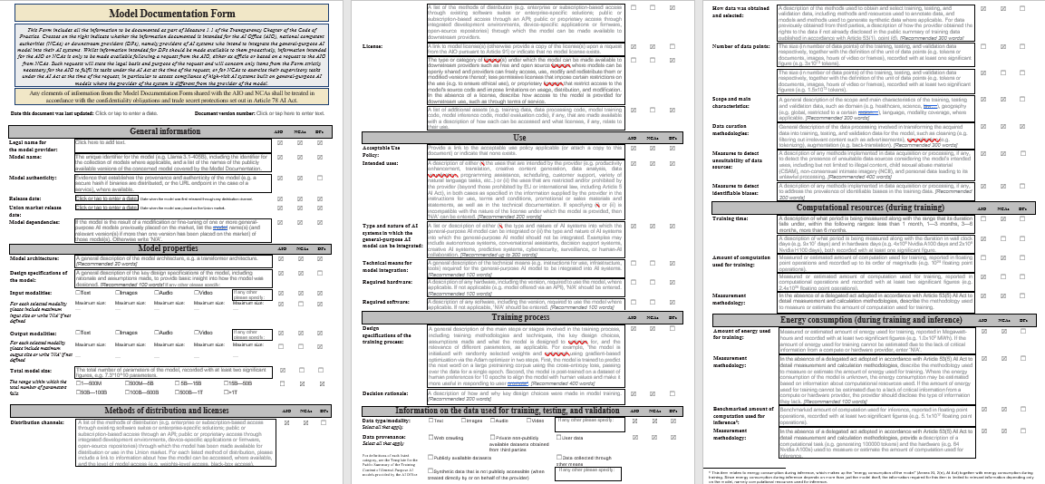 Transparency AI developers must disclose critical information about their systems using a standardized Model Documentation Form. This includes data sources, model purposes, design specifications etc. Open-source models are partially exempt unless deemed systemically risky. The goal is public and regulatory visibility into how major AI models function.