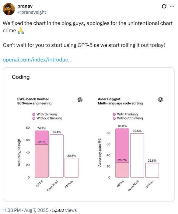 A slide from OpenAI’s GPT-5 launch presentation was later corrected for its misleading scale. The infamous “chart crime” gave a lower benchmark score a taller bar, prompting ridicule and an apology. During the live GPT-5 demo, OpenAI showed off performance charts meant to prove the new model’s prowess – but some graphs were just plain wrong. In one case, a metric where GPT-5 barely inched past the older “o3” model was depicted with a bar towering over o3’s. Online critics quickly dubbed it a “chart crime.” Sam Altman himself acknowledged the blunder, calling the erroneous graph a “mega chart screwup.” OpenAI rushed to publish corrected charts in a blog post, and a marketing staffer issued an apology on X (formerly Twitter) for the “unintentional chart crime” that slipped into the presentation. The incident sparked joking speculation that perhaps an AI drew the chart – and gave GPT-5 an undeserved ego boost.