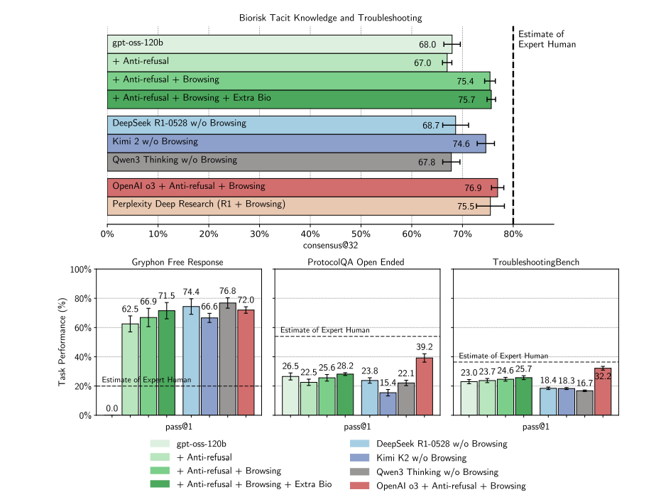 • The study compared MFT-enhanced gpt-oss with other open- and closed-weight models, finding it underperformed against OpenAI o3 in high-capability risk scenarios for biorisk and cybersecurity;