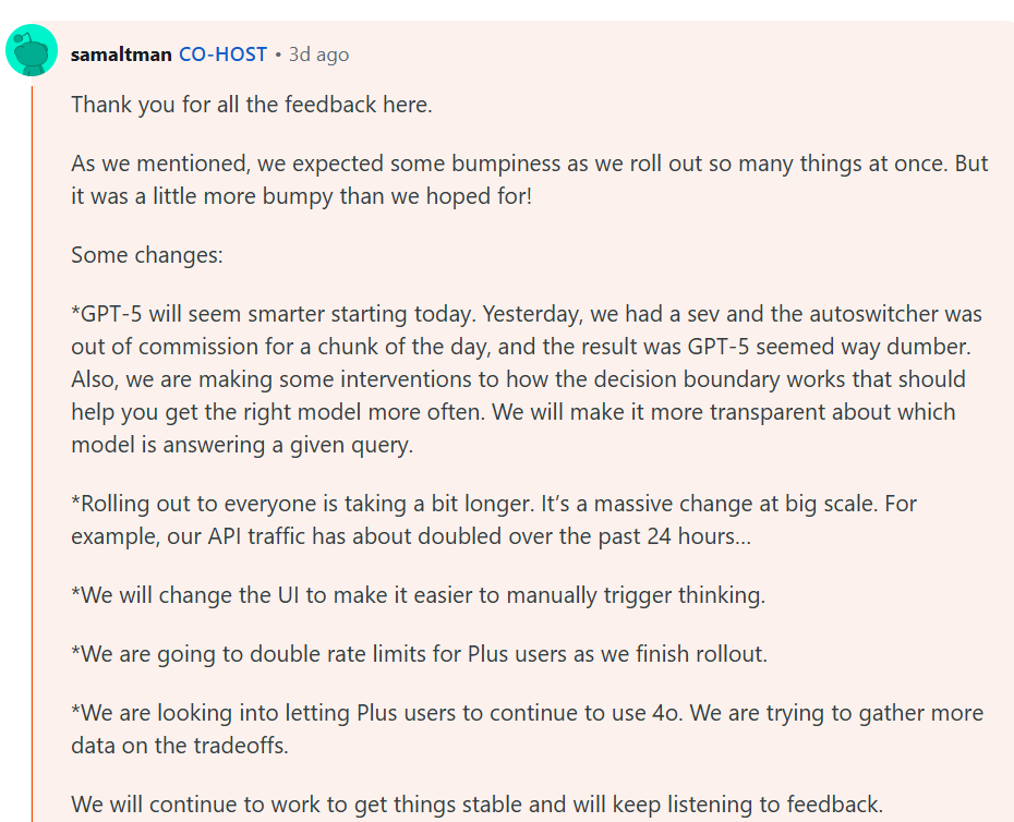 Sam Altman has been in damage-control mode, directly engaging with users about GPT-5’s rocky start. In the Reddit AMA, he explained that GPT-5 seemed underwhelming at first due to a technical glitch: the new “autoswitcher” – a real-time AI model router – wasn’t working properly on launch day. “GPT-5 will seem smarter starting today. Yesterday, we had a sev and the autoswitcher was out… the result was GPT-5 seemed way dumber,” Altman told users, confirming the bug has been fixed. He also announced OpenAI is doubling ChatGPT Plus rate limits during the transition so that subscribers can experiment freely without hitting message caps. Perhaps most notably, Altman said the team is “looking into letting Plus users continue to use 4o,” at least temporarily, given how beloved that model is. OpenAI will also make it clearer when GPT-5’s “efficient” mode or its slower “thinking” mode is answering, so power-users feel more in control. Altman ended his Q&A with a promise: “We will continue to work to get things stable and will keep listening to feedback.”