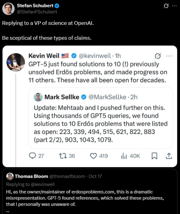 Meta’s chief AI scientist Yann LeCun and Google DeepMind CEO Demis Hassabis expressed skepticism over claims made by OpenAI researchers regarding GPT-5’s alleged breakthroughs in solving Erdős problems. A Vice President at OpenAI had tweeted that GPT-5 solved several longstanding mathematical problems, which was later revealed to be a misrepresentation. According to mathematician Thomas Bloom, GPT-5 simply found existing literature that addressed these problems rather than solving unsolved ones. OpenAI’s Sebastien Bubeck acknowledged this but maintained that identifying solutions in the literature is still notable.