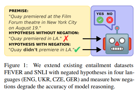 • Current studies extend existing datasets by including negated hypotheses to evaluate the impact of negations on reasoning accuracy across different languages in text entailment tasks.