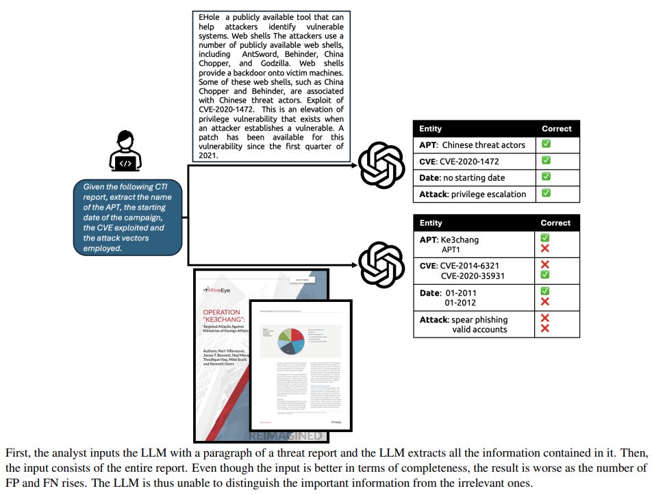 • Despite promising results in small-scale tests, LLMs fail to deliver reliable performance in processing extensive CTI documents, raising concerns about their practical application in cybersecurity