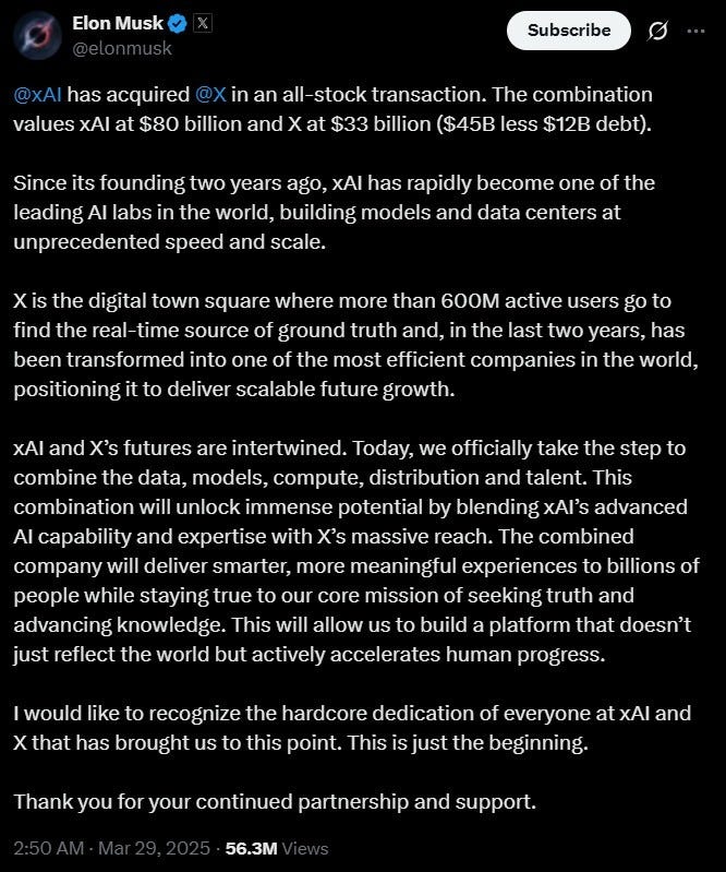 • Elon Musk's AI startup, xAI, completes acquisition of social media platform X in an all-stock deal, valuing xAI at $80 billion and X at $33 billion;