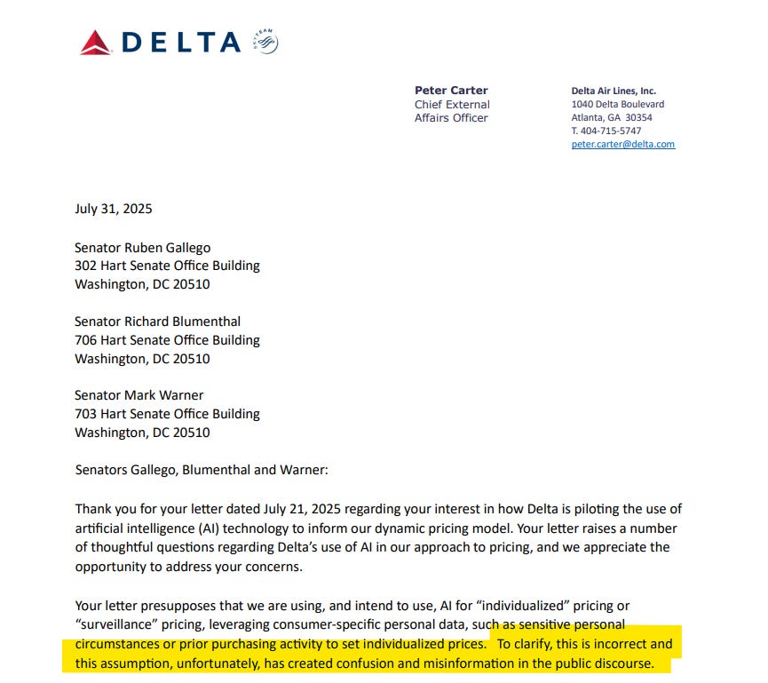 Under pressure from these lawmakers and amid broad public concern, Delta quickly clarified its stance. In the latest letter to the senators, Delta assured that it will not use AI for personalized pricing of tickets. The airline emphasized that while it is indeed adopting new AI-based revenue management tools (in partnership with Fetcherr, an AI pricing company), these tools would only be used to streamline traditional dynamic pricing – analyzing market data faster – not to adjust fares based on any individual’s personal data. Delta’s letter stated unequivocally: “There is no fare product Delta has ever used, is testing or plans to use that targets customers with individualized prices based on personal data… Our ticket pricing never takes into account personal data.” Senators welcomed this commitment but remained skeptical, pressing Delta for details on what data its AI does use and why Delta’s messaging to investors about AI capabilities sounded different from its public reassurances.