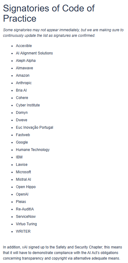 • U.S. giants Amazon, Anthropic, Google, IBM, Microsoft, and OpenAI signed the code, while xAI only committed to one chapter, indicating partial compliance with the structured guidelines