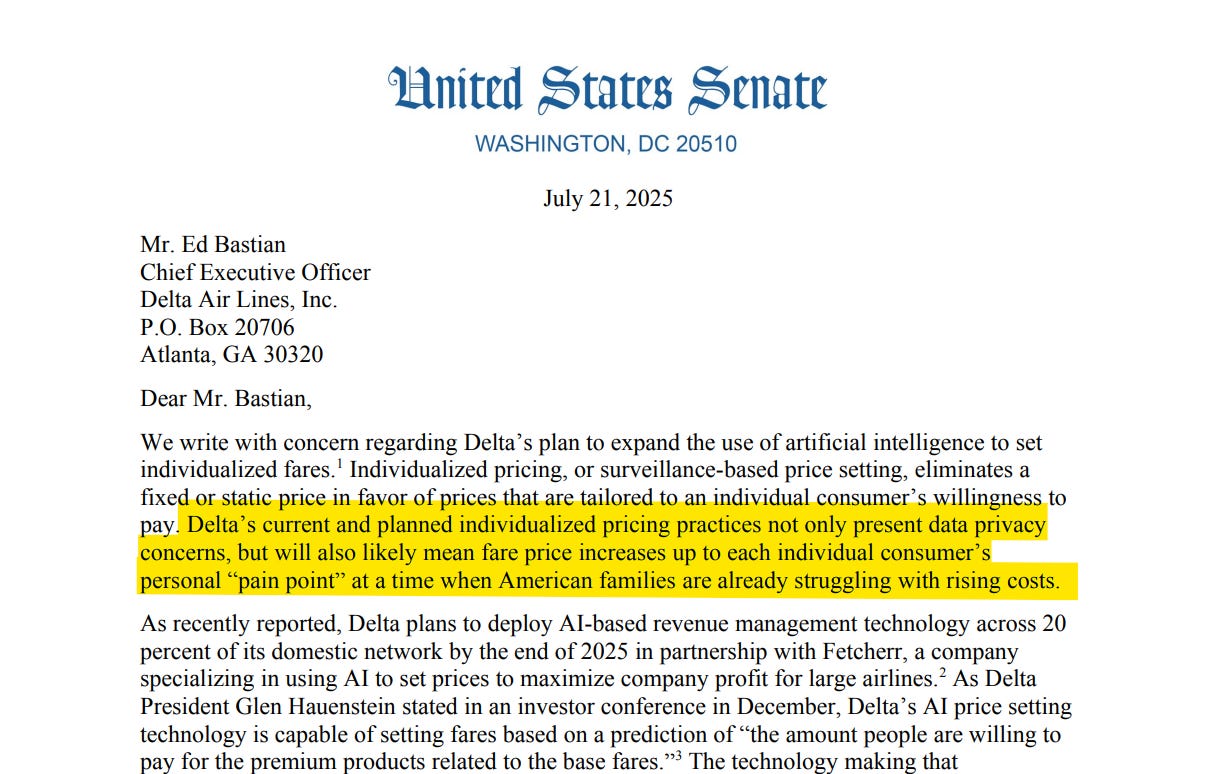 What happened? Recently Delta Air Lines faced scrutiny over plans to use artificial intelligence (AI) in ticket pricing. During a Q2 2025 earnings call, Delta’s president Glen Hauenstein revealed the airline was testing an AI-driven pricing system on a small portion of fares (about 3% of domestic fares) with aims to expand it to 20% of its network by the end of 2025. This sparked concern among U.S. lawmakers after comments suggested the technology could potentially price tickets based on what each customer might be willing to pay – effectively charging individuals up to their personal “pain point” (as raised by senators). In late July 2025, three senators (Ruben Gallego, Mark Warner, and Richard Blumenthal) publicly warned that Delta appeared poised to set individualized airfare prices using AI, which they feared would mean higher fares tailored to each traveler’s maximum willingness-to-pay.
