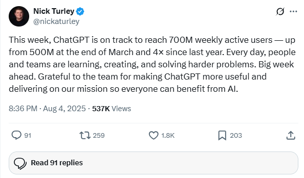 • ChatGPT is projected to reach 700 million weekly active users, marking significant growth from the 500 million users reported earlier this year