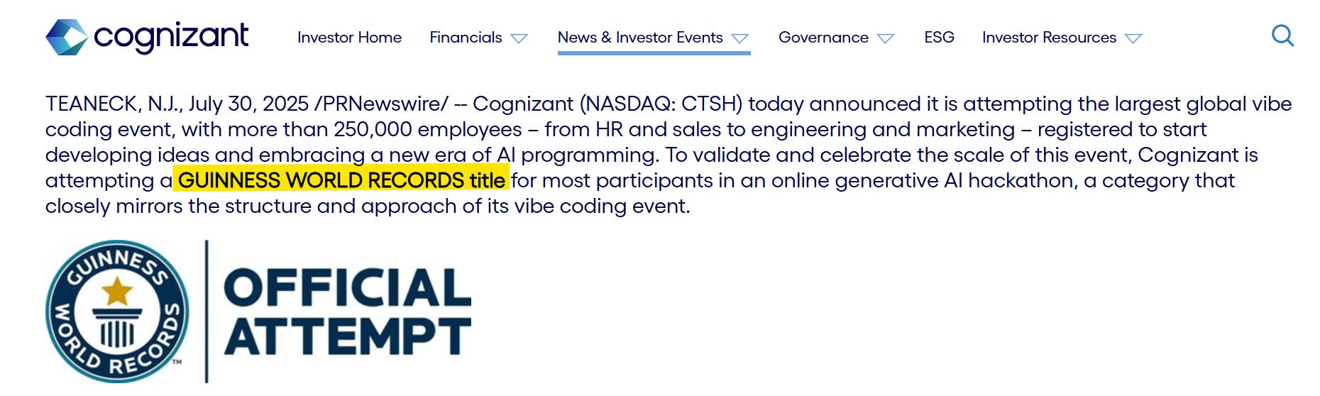 • Cognizant, in collaboration with partners like GitHub Copilot and Lovable, is hosting a massive vibe coding event aiming for a Guinness World Record for the most participants in an online generative AI hackathon