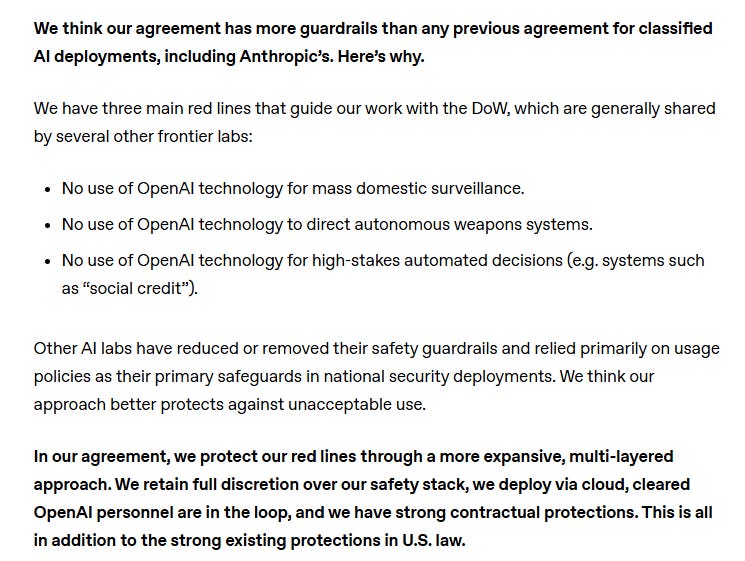 OpenAI’s approach was to accept a Pentagon contract with safeguards included, but framed differently: rather than explicit prohibitions written into the DoD’s contract in the same way Anthropic wanted, OpenAI’s safeguards rely on a combination of existing laws, contractual language, deployment constraints (e.g., cloud-only), and internal safety layers. Critics argue these may be weaker or more open to interpretation than Anthropic’s explicit red lines.