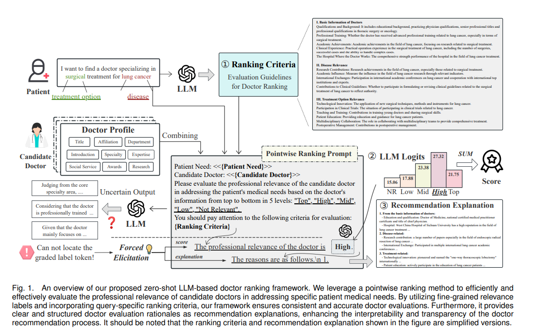 • A new framework leverages large language models for explainable doctor recommendation, focusing on ranking doctors by their relevance to disease-treatment pairs in a zero-shot setting