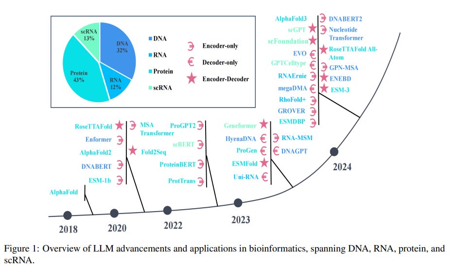 • Large Language Models (LLMs) are driving groundbreaking advancements in bioinformatics, facilitating sophisticated analyses of genetic sequences, RNA structures, proteins, and single-cell data