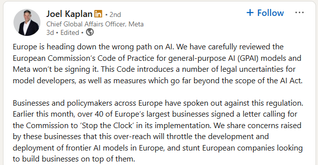 Notably Absent or Refusing: Despite the broad uptake, several big names have conspicuously not signed the Code of Practice. The most public stance has come from Meta (Facebook’s parent). Meta flatly refused to join, with its global affairs chief Joel Kaplan arguing that the code creates “legal uncertainties for model developers” and imposes measures “far beyond the scope of the AI Act.” In a July 18 LinkedIn post, Kaplan warned that the EU’s approach would “throttle the development and deployment of frontier AI models in Europe” and “stunt European companies” building on AI. In other words, Meta sees the EU’s voluntary code (and the regulations behind it) as regulatory overreach that could slow innovation. Meta’s stance has aligned with a broader tech industry pushback in Europe – indeed, Kaplan cited concerns shared by 45 European companies who in June urged Brussels to delay the AI Act, fearing “unclear, overlapping and increasingly complex” rules would hurt Europe’s competitiveness.