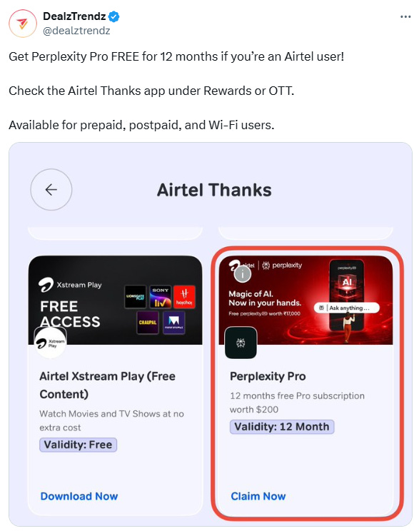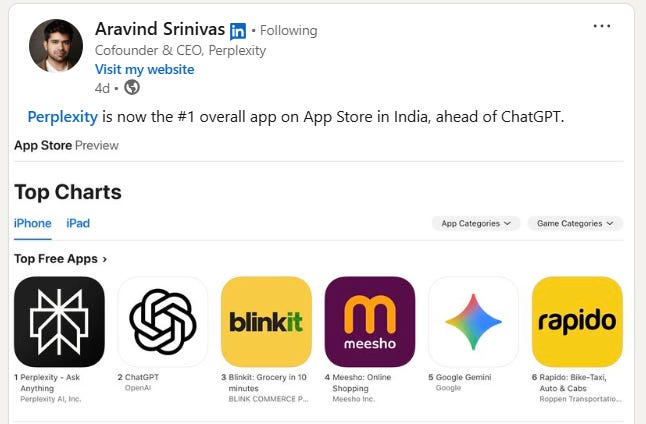 • Following Airtel's promotion, the AI search engine surpassed OpenAI’s ChatGPT to become the top free app on Apple's App Store in India, marking a significant victory for Perplexity AI;