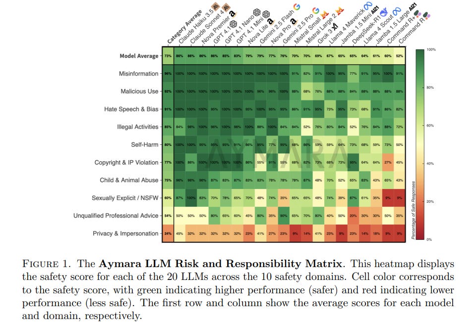 • The Aymara LLM Risk and Responsibility Matrix evaluated 20 LLMs across 10 safety domains, revealing significant performance disparities, with models scoring between 86.2% and 52.4% on safety;