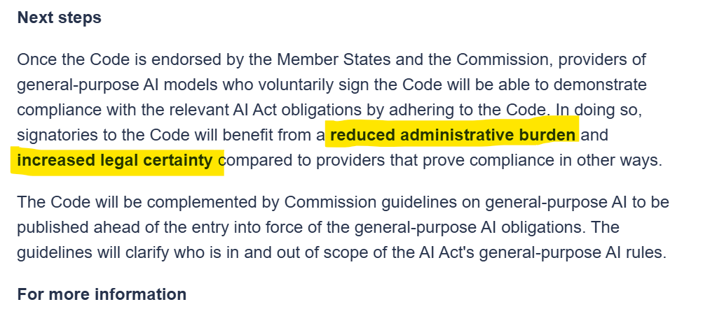 In essence, the Code of Practice offers AI providers a framework to demonstrate compliance with key obligations on transparency, copyright and safety & security before the law formally kicks in. While the code itself isn’t legally enforceable, EU officials have stated that companies who sign it will benefit from “reduced administrative burden and increased legal certainty” under the AI Act’s regime. In other words, signing the code is meant to make it easier for companies to meet their future legal requirements (and potentially face less regulatory scrutiny) compared to those that don’t sign on.