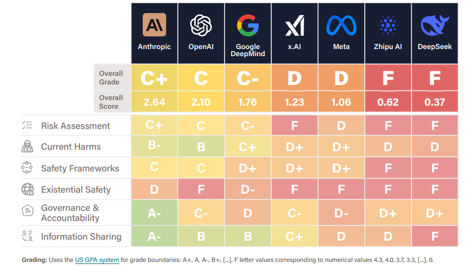 • Despite ambitions for artificial general intelligence within the decade, none of the companies scored above D in Existential Safety planning, a deeply concerning finding for experts.