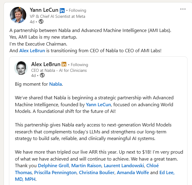 Yann LeCun, a prominent AI scientist, has launched a new startup, Advanced Machine Intelligence (AMI), but will not serve as CEO. Instead, Alex LeBrun, formerly of Nabla, will lead the company. AMI aims to develop world model AI, a potential alternative to large language models, and is reportedly seeking to raise €500 million at a valuation of €3 billion. With a prestigious background, including being a Turing Award winner, LeCun’s involvement is drawing significant attention in the AI community. Meanwhile, LeBrun will transition to his new role as Nabla appoints interim leadership and plans to use AMI’s models in future developments.