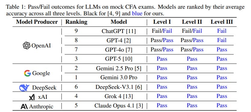 Recent research reveals that state-of-the-art reasoning models have achieved impressive results on the rigorous Chartered Financial Analyst (CFA) exams, which demand a blend of numerical, qualitative, and ethical reasoning. In a study examining mock CFA exams with 980 questions across all three levels, models like Gemini 3.0 Pro, GPT-5, and others demonstrated high proficiency, with Gemini 3.0 Pro achieving near-perfect scores on Level I and strong results across Levels II and III. This marks a significant improvement in AI performance on high-stakes finance-specific assessments, a field where past models underperformed.