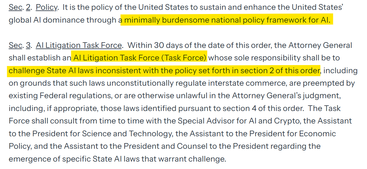 On December 11, 2025, President Trump signed an Executive Order called “Ensuring a National Policy Framework for Artificial Intelligence.” The order says that different AI rules in all 50 states are creating confusion and hurting America’s chances of staying ahead in the global AI race. So, Trump wants one federal law for AI instead of many different state laws. He created an AI Litigation Task Force inside the Department of Justice to sue states with “too strict” AI rules. He also told the Commerce Department to review state AI laws and cut off federal funding for states that don’t follow the national policy. Agencies like the FCC and FTC were asked to create common AI rules- especially for things like AI disclosure, bias, and truthful outputs. The administration says this is about promoting innovation, national security, and free speech, and claims that some state laws are too political or censor what AI can say.