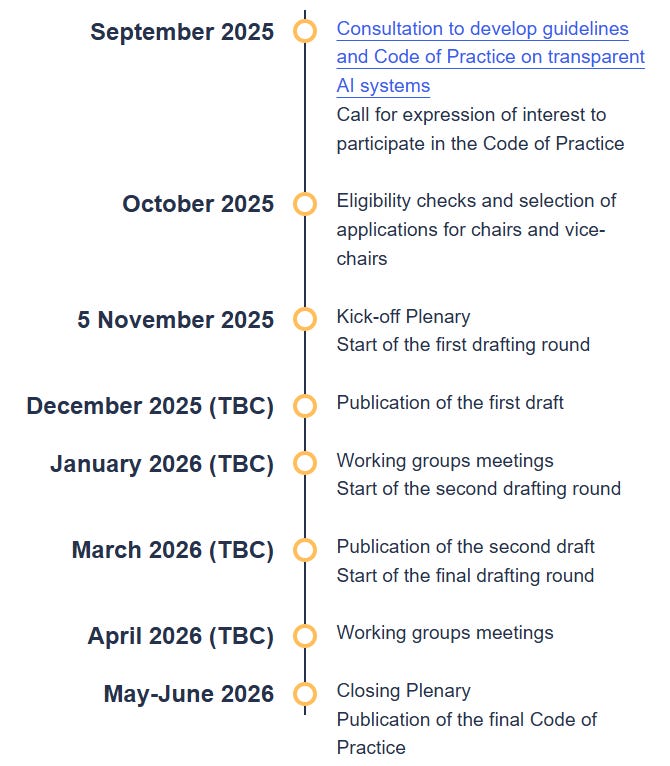 The AI Office has initiated the development of a Code of Practice to assist in meeting transparency obligations under Article 50 of the AI Act, concerning the marking and labeling of AI-generated content, including deep fakes. Two working groups will guide the drafting process, focusing on obligations for providers and deployers of generative AI systems to ensure content is clearly marked and disclosed. Stakeholders, including civil society and academic experts, are involved in a seven-month drafting process, with the completed Code serving as a voluntary compliance tool ahead of the rules set to be enforced in August 2026.