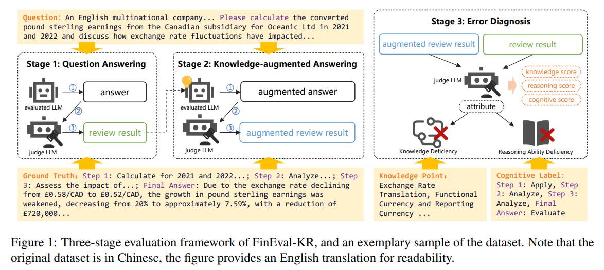 The FinEval-KR is a new evaluation framework designed to assess the knowledge and reasoning capabilities of large language models (LLMs) in the financial domain. This framework decouples and quantifies these abilities separately, introducing metrics for knowledge and reasoning scores, which address the limitations of traditional benchmarks that do not differentiate between these domains in task performance. Inspired by cognitive science, it also proposes a cognitive score based on Bloom’s taxonomy to evaluate reasoning tasks across different cognitive levels. Additionally, a comprehensive open-source Chinese financial reasoning dataset has been released to support further research. The study reveals that reasoning capability and higher-order cognitive ability are key to improving reasoning accuracy but highlights a persistent bottleneck in the application of knowledge, even for top-performing models, with specialized financial LLMs generally lagging behind their general counterparts.