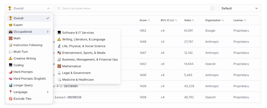 The latest developments in large language model (LLM) evaluation have introduced Arena Expert and Occupational Categories, focusing on challenging LLMs with expert-level problems across 23 diverse fields of practice, such as Software and IT Services, Writing, Science, and Healthcare. Arena Expert refines model assessment by identifying “expert” prompts that showcase nuanced differences in models’ performances, producing sharper score distinctions than general benchmarks. The Occupational Categories classify prompts based on disciplines, revealing model specialization or generalization across fields. The initiative, leveraging LMArena’s established framework, aims to refine LLM evaluations by capturing the depth and breadth of domain expertise, offering a scalable alternative to curated benchmarks and enabling continuous, real-world data collection through crowdsourcing.