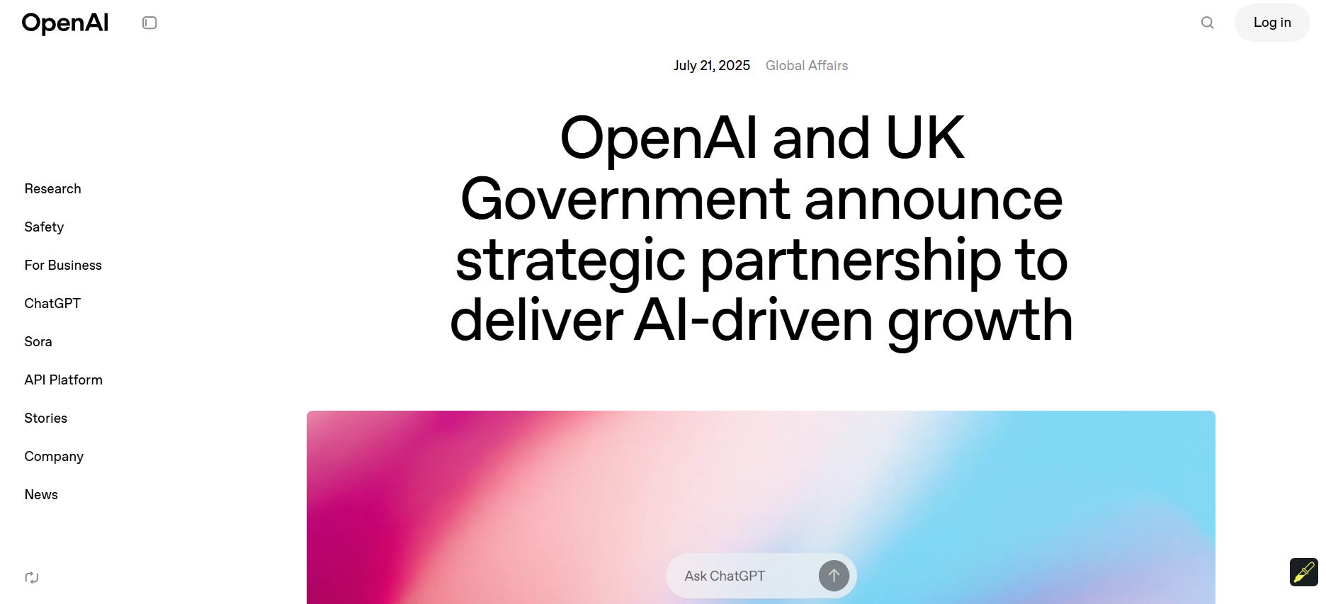 • OpenAI and the UK Government have entered a strategic partnership aimed at accelerating AI adoption, aligning with the UK's AI Opportunities Action Plan for economic growth.