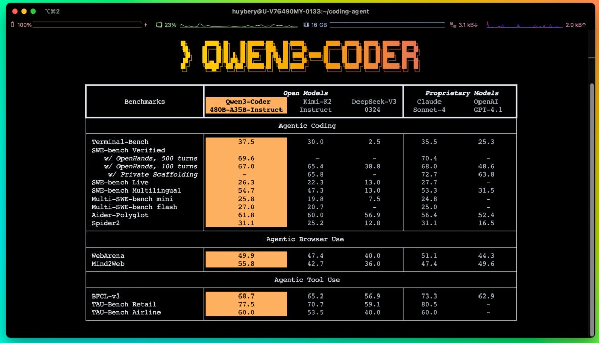 • Qwen3-Coder, derived from Gemini Code, uses custom prompts and protocols for agentic coding and integrates with top developer tools to maximize performance