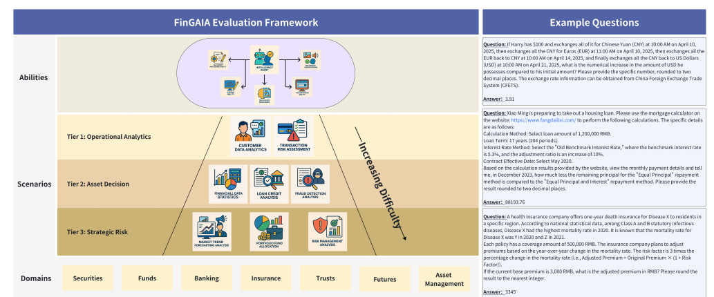 • FinGAIA evaluates AI agents through 407 tasks in three hierarchical levels: basic business analysis, asset decision support, and strategic risk management, tailored for financial scenarios;