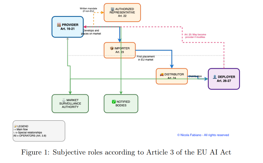 The paper provides a structured examination of the six main categories of actors — providers, deployers, authorized representatives, importers, distributors, and product manufacturers — collectively referred to as “operators” within the regulation. Through examination of these Article 3 definitions and their elaboration across the regulation’s 113 articles, 180 recitals, and 13 annexes, they map the complete governance structure and analyze how the AI Act regulates these subjects.