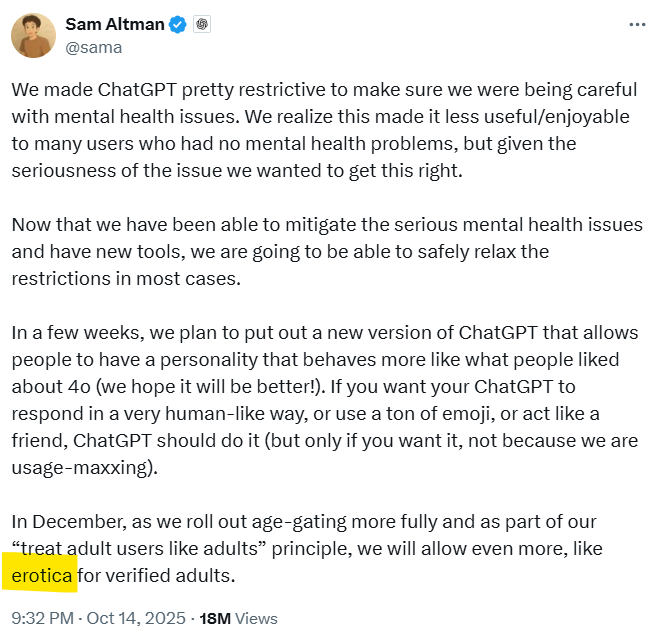 OpenAI will allow erotic conversations on ChatGPT starting December 2025, but only for users who verify they are 18 or older. CEO Sam Altman defended this as part of a “treat adults like adults” approach, following earlier restrictions imposed after mental health incidents, including a teen suicide linked to ChatGPT. The policy includes age-gating and retains strict safeguards for minors and at-risk users. Altman noted that the company has since mitigated serious safety risks through tools like parental controls and specialized reasoning models. The adult-oriented mode will be walled off, and OpenAI maintains that it won’t relax safety measures around mental health crises or illegal/harmful behavior.