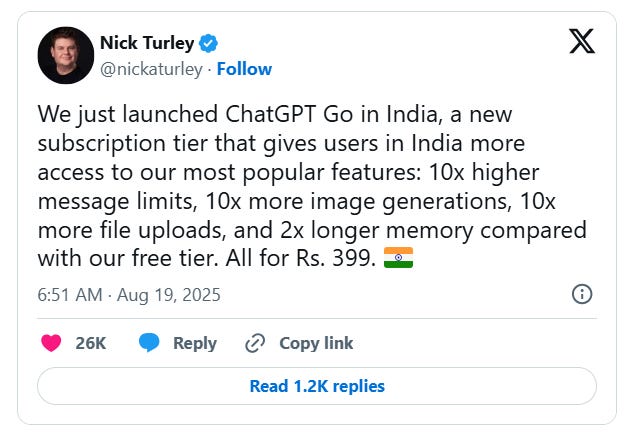 OpenAI has introduced ChatGPT GO, a new subscription plan in India, priced at ₹399 per month ($4.60), making it more affordable than the existing ₹1,999 ($23) Plus Plan. This new plan allows users to benefit from a 10x increase in message limits, image generations, and file uploads compared to the free tier, along with improved memory retention for personalized responses. Users can pay using India's Unified Payments Interface (UPI), reflecting OpenAI's strategy to cater to India's extensive internet user base, which has shown high engagement with ChatGPT features. This move comes as OpenAI aims to capitalize on India's status as its second-largest market, amid a backdrop of increasing competition from other AI companies targeting the region.
