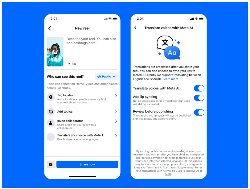 Meta is expanding its AI-powered voice translation feature globally on Facebook and Instagram, allowing creators to translate content into different languages using their own tone and voice. Initially announced at the Connect developer conference last year, this feature supports English to Spanish translations and is accessible to Facebook creators with over 1,000 followers and all public Instagram accounts. The feature, which aims to make content more accessible by overcoming language barriers, also includes a lip-sync option and allows creators to upload up to 20 dubbed audio tracks to enhance reach. Further language support is anticipated, although details on future additions remain undisclosed. This development comes amid Meta's ongoing restructuring of its AI group to enhance focus on research, superintelligence, products, and infrastructure.